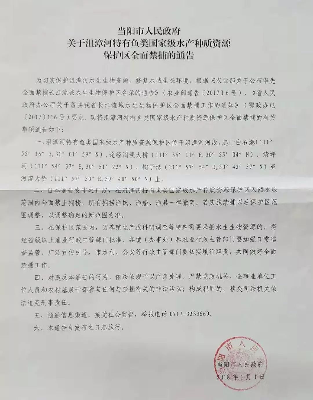 《当阳市人民政府关于沮漳河特有鱼类国家级水产种质资源保护区全面禁捕的通告》发布,