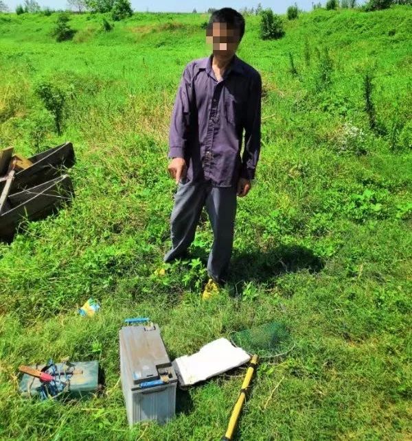 一名男子无视巨大的“禁捕告知”宣传牌,使用电捕鱼器捕捞水产品鲤鱼、鲫鱼共2公斤。