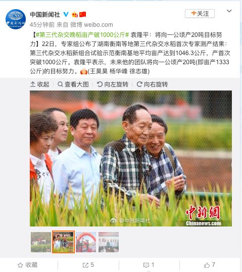 22日,专家组公布了湖南衡南等地第三代杂交水稻首次专家测产结果:第三代杂交晚稻新组合表现优势强,亩产突破1000公斤。袁隆平表示,水稻生产要由“吃饱”向“吃好”努力!