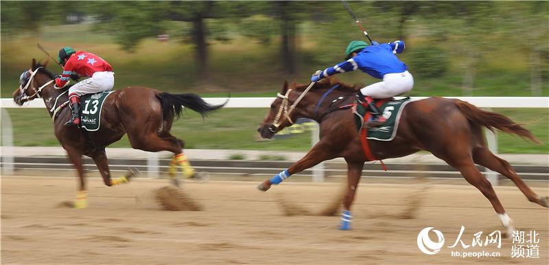 当日下午,有近万名中外观众,在武汉东方马城观赏了6场精彩赛事。来自全国各地22家赛马俱乐部近百位马主旗下的500余匹赛驹汇聚武汉,共计有92匹马报名参加本届赛马节6场赛事,83匹赛驹已获出赛正选席位,其中五场赛事满闸出赛。应邀来自法国、意大利、澳大利亚、南非、韩国、马来西亚、菲律宾、印度等国的骑师同中国骑师一起参赛,策骑了13匹伊犁赛驹出战。(李长林 摄)
