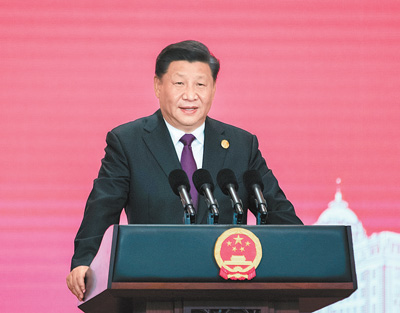 11月4日晚,国家主席习近平和夫人彭丽媛在上海和平饭店举行宴会,欢迎出席第二届中国国际进口博览会的各国贵宾。这是习近平发表致辞。