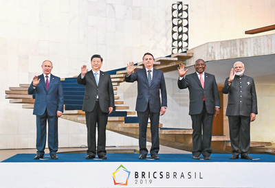 当地时间11月14日,金砖国家领导人第十一次会晤在巴西首都巴西利亚举行。巴西总统博索纳罗主持会晤。中国国家主席习近平、俄罗斯总统普京、印度总理莫迪、南非总统拉马福萨出席。习近平发表题为《携手努力共谱合作新篇章》的重要讲话。