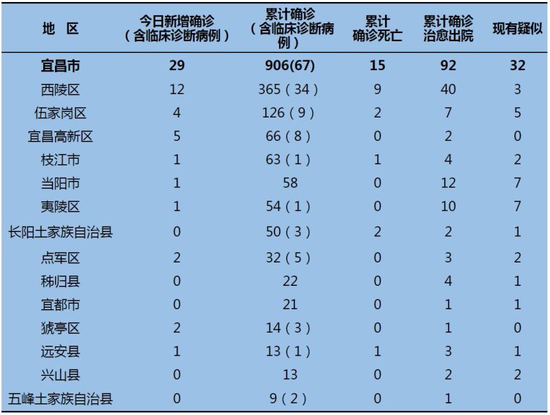 现有疑似病例32例,无重症、危重症病例。疑似病例中夷陵区7例、当阳市7例、伍家岗区5例、西陵区3例、点军区2例、枝江市2例、兴山县2例、宜都市1例、远安县1例、秭归县1例、长阳土家族自治县1例,猇亭区、宜昌高新区、五峰土家族自治县均无疑似病例。