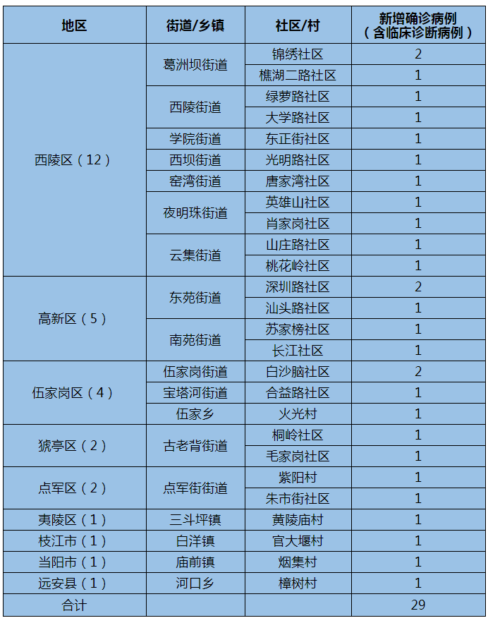 2020年2月14日0—24时,宜昌市报告新型冠状病毒肺炎新增确诊病例29例(含临床诊断病例16例)。其中:西陵区12例、宜昌高新区5例、伍家岗区4例、点军区2例、猇亭区2例、夷陵区1例、枝江市1例、当阳市1例、远安县1例,宜都市、秭归县、兴山县、长阳土家族自治县 、五峰土家族自治县均无新增确诊病例。新增治愈出院11例(当阳市6例、秭归县2例、西陵区1例、伍家岗区1例、枝江市1例)。新增死亡2例(西陵区1例、伍家岗1例)。