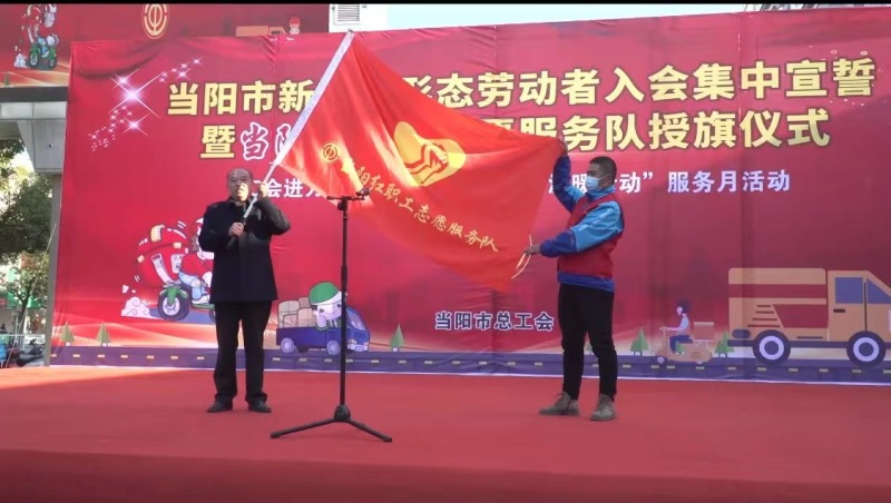 仪式上,市总工会相关负责人通报了我市新就业形态劳动者建会入会情况、“当阳红”职工志愿服务队组建情况,并为“当阳红”职工志愿服务队授旗,倡议全市广大职工亮明自己身份,弘扬劳模精神;树立价值导向,弘扬劳动精神;立足本职岗位,弘扬工匠精神,争当志愿服务活动排头兵、争做志愿服务精神践行者,推动志愿服务活动深发展。活动现场,全市75名新就业形态劳动者代表进行入会集中宣誓,我市新就业形态劳动者、“当阳红”职工志愿服务队代表、快递员分别进行了发言。活动还向新入会的新就业形态劳动者赠送了劳动保护用品。