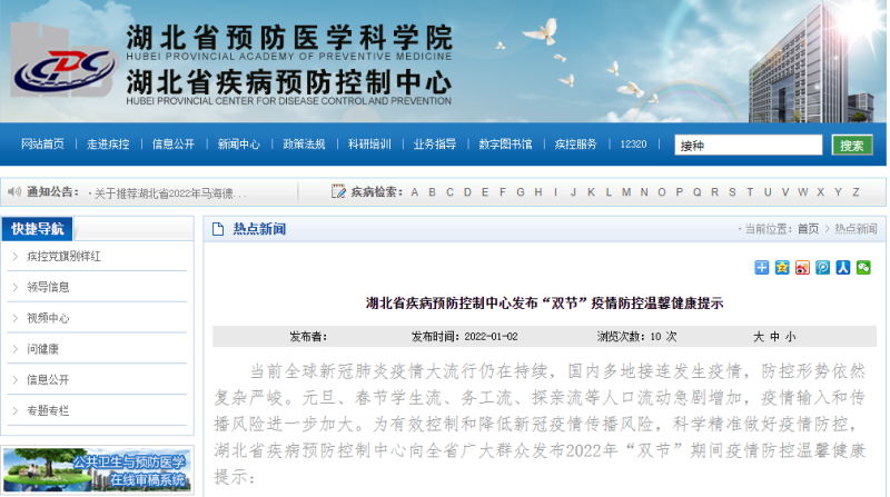 非必要不出省!湖北疾控最新提示 2022-01-03 09:34 0 当前全球新冠肺炎疫情大流行仍在持续,国内多地接连发生疫情,防控形势依然复杂严峻。元旦、春节学生流、务工流、探亲流等人口流动急剧增加,疫情输入和传播风险进一步加大。为有效控制和降低新冠疫情传播风险,科学精准做好疫情防控,湖北省疾病预防控制中心向全省广大群众发布2022年“双节”期间疫情防控温馨健康提示: 一、广大群众要养成良好的个人卫生习惯,保持良好的个人防护意识,养成随身携带口罩,科学规范佩戴口罩(尤其是在乘坐公共交通工具和在公共场所活动时),勤洗手,常通风,保持安全社交距离的卫生习惯;不扎堆、不聚会,配合遵守公共场所测温、验码、一米距等疫情防控规定。 二、倡导线上拜年,提倡用微信、网络、电话等方式拜年,减少走亲访友规模频次,家庭聚会尽量少于10人。提倡“喜事缓办,丧事简办,宴会不办”。尽量举办线上会议或视频会议。 三、非必要不出省。鉴于国内外疫情现状,坚持非必要不出省,密切关注近期国内外疫情进展情况,不去中高风险地区和报告确诊病例地区旅游、出差、探亲。确需出行,提前做好行程规划,全程做好个人防护。候机、候车时,要在空气流通的空间等候,不在拥挤、密闭场所久留。老人、孕产妇及有慢性病的特殊人群,建议不出行。 四、尽早全程接种疫苗。接种新冠病毒疫苗是预防新冠肺炎最安全、最有效的手段,更是每一位公民应尽的责任和义务。请符合接种条件的群众,尽早主动完成疫苗全程接种,满半年后及时接种加强针,尽快构建全民免疫屏障。 五、一旦出现发热、干咳、乏力、嗅觉味觉异常、腹泻等不适症状,不要自行用药,应及时就近到发热门诊就诊,并主动告知医生自己的旅行史。就诊过程中请做好个人防护并不得乘坐公共交通工具。 六、近14日以来有中高风险地区旅居史、中高风险地区所在市的低风险地区、有病例报告地区来鄂返鄂人员,或与已公布的病例活动轨迹有交集者,请主动向居住地所在社区及辖区疾控中心报备相关情况,进行核酸检测并配合落实相关防控措施。对因瞒报、谎报造成严重后果的,将依法依规严肃追究责任。 七、全省宾馆、酒店、民宿等提供住宿的单位,医院、商超、景点、饭店、理发店等公共场所要严格落实对所有入住旅客、进店顾客、就医人员等测温、查验健康码和行程码,发现体温异常或健康码、行程码异常,或有涉疫地区旅居史的来鄂返鄂人员,要及时向所在社区及辖区疾控中心报告,并配合落实相关管控措施。