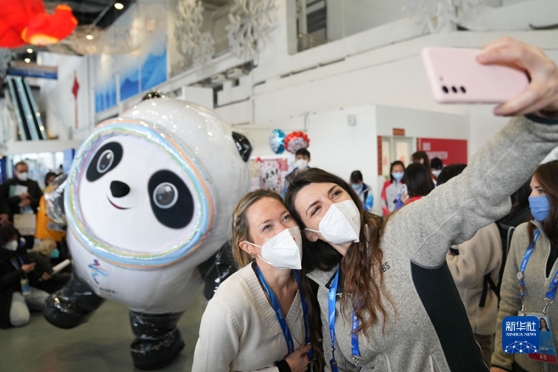 2月12日,北京冬奥会主媒体中心举办集体采访活动,现场观众与北京2022年冬奥会吉祥物“冰墩墩”自拍留念。 新华社记者 鞠焕宗 摄