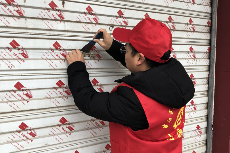 活动中,志愿者穿戴红马甲和小红帽,手拿钢刷、铲子、抹布等工具,对单位门前及包街路段、背街小巷范围内的门店、墙面、电线杆野广告及门店玻璃橱窗上乱贴乱画的“牛皮癣”进行彻底清理。