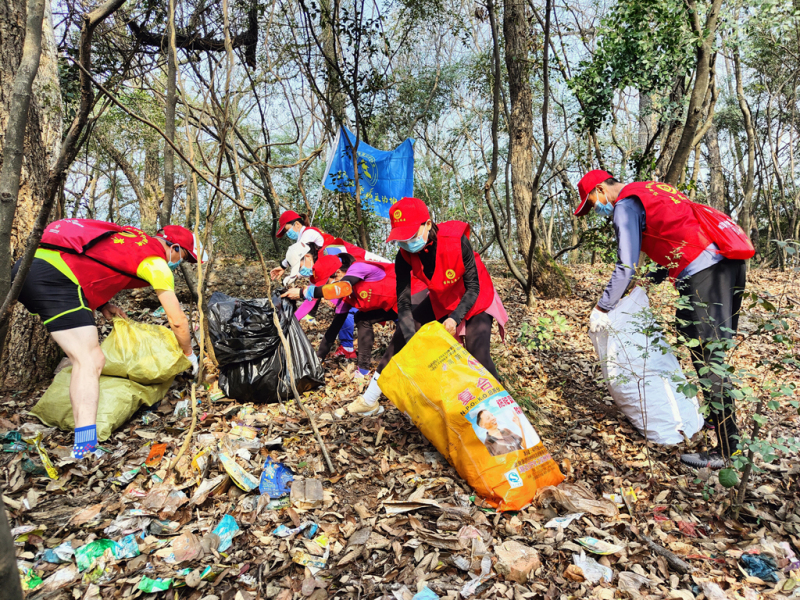 活动中,身穿红马甲头戴小红帽的志愿者们手拎口袋拾级而上,沿途弯腰在台阶两侧山林里认真捡拾路人丢弃的碎纸屑、塑料袋、饮料瓶、烟头等杂物,志愿者们齐心协力、密切配合,确保景区环境卫生不留“死角”和“盲点”。