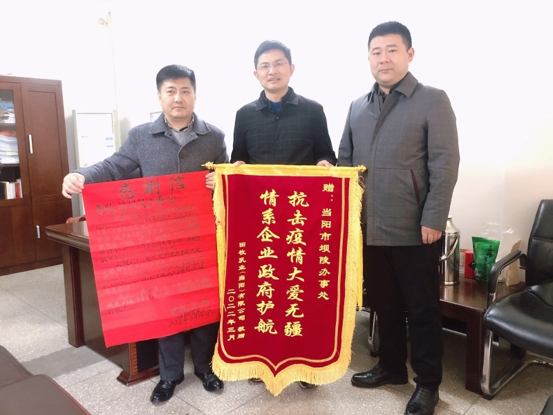 本网讯(李祺宇、刘善新)3月21日,田牧乳业(当阳)有限公司将一面写着“抗击疫情大爱无疆,情系企业政府护航”的锦旗送到坝陵街道办事处,对该街道伸出援手为企业护航的行为表示感谢。