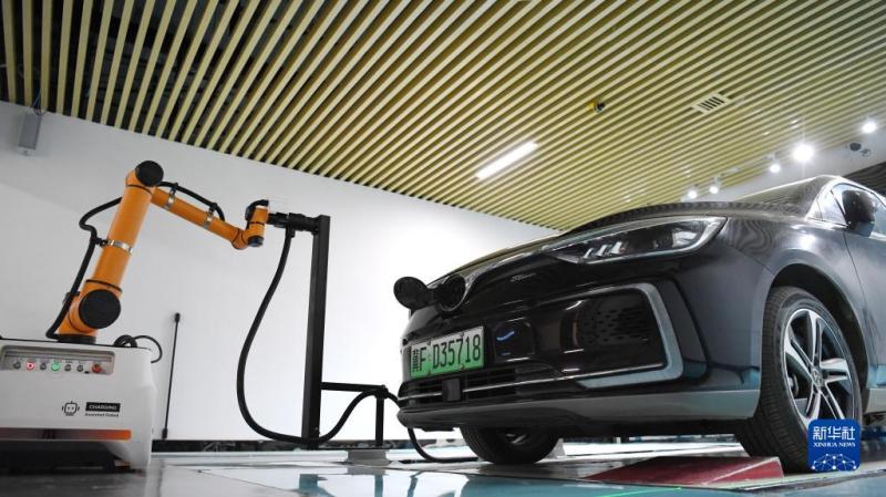 在雄安新区剧村变电站智慧充电区,插拔枪机器人为一辆电动汽车充电(3月18日摄)。新华社记者 朱旭东 摄
