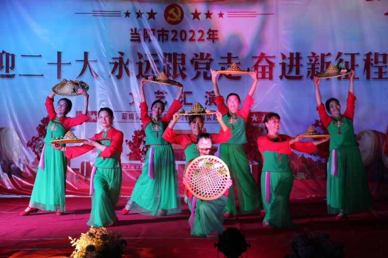 文艺汇演在《欢聚一堂》优美的舞姿和激越的腰鼓声中拉开序幕。歌曲《我在草埠湖等你来》、快板《疫情宣传》、斗笠舞《我在茶乡等你来》、器乐演奏《农垦精神永放光彩》、情景剧《丰收乐》等20多个精彩纷呈的节目轮番上演,为大家带来了一场精妙的视听盛宴。文艺演出现场气氛活跃,台下群众热情高涨,喝彩声不断,阵阵欢声笑语萦绕在舞台周围。