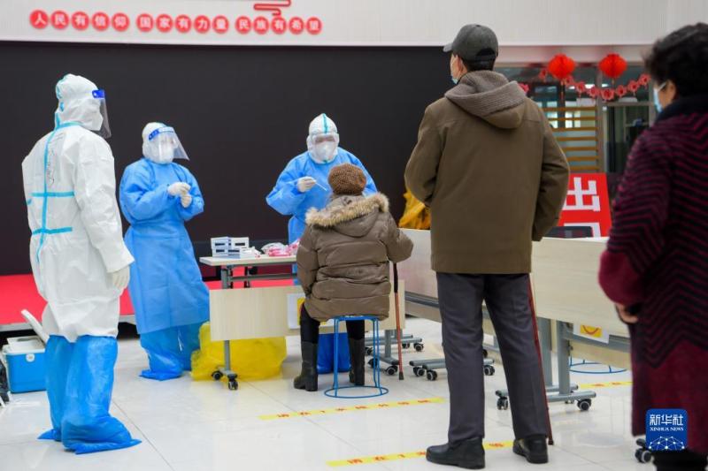 在内蒙古满洲里市东山街道办事处怡园社区府欣小区A区核酸采样点,工作人员为居民做核酸采样(2021年11月29日摄)。新华社记者 李志鹏 摄