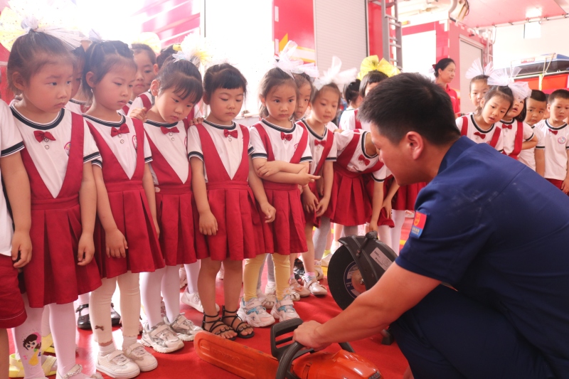 当孩子们走进消防站,立刻被各种消防器材吸引了,有无齿距、救生抛投器……孩子们零距离接触了各类消防器材。在消防指战员的讲解中,小萌娃们认真听讲、仔细观看、积极参与,还提出很多非常有趣的问题,消防员都一一进行了解答。特别在体验试穿战斗服环节,小朋友们个个兴奋异常,积极参与互动。消防员叔叔不出警时干什么?他们平时是怎么训练的……孩子们的好奇、疑问在消防员的讲解演练中得到了答案。