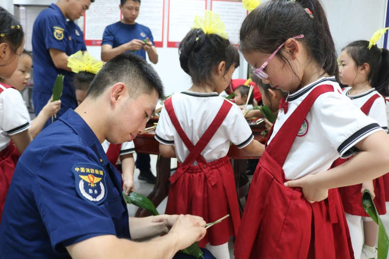 活动最后,消防救援人员与师生共同在食堂开展包粽子活动,“蓝朋友”手把手的向幼儿园师生讲解包粽子的方法,小朋友们虽从未接触过包粽子,但一个个学起来都有模有样,你瞧我看,你教我学..……不一会儿,三角形、正方形……各种奇形怪状的粽子新鲜出炉,小小的粽子把爱连接在一起,让孩子感受到可贵的团队精神、享受自己劳动果实的喜悦。