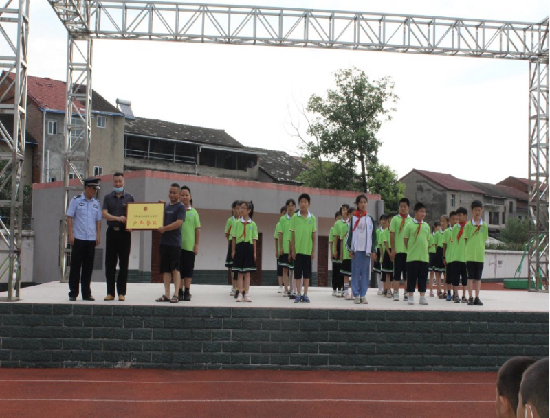 根据市公安局、市教育局关于在全市中小学校开展“塑心+立行”少警工程实施计划部署安排,经市公安局、市教育局党组研究同意,市公安局、市教育局联合举办“做自己的首席安全官-少年警察梦”校园行全市小学少年警队授旗授牌启动仪式暨暑期特训营活动开营式。活动中,河溶镇派出所领导宣读了关于成立少年警队的决定,派出所及中心学校领导为河溶镇中心小学少年警队授牌,该校第一批30名少年警队队员集体宣誓,为他们的警察梦庄严承诺“恪守少年警队理念,争当校园首席执行官,争当新时代好少年,为实现伟大的中国梦而努力奋斗”。