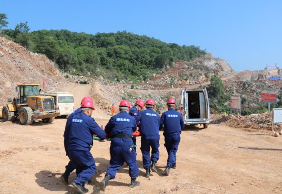 演练过程模拟+720平台坍塌引发物体打击事故,造成一名作业人员受伤被困。险情发生后,该矿立即启动应急预案,成立现场救援指挥部,组织相关人员前往事故现场施救,并电话报告市应急管理局。市应急管理局接到报告后,当即启动应急预案,组织矿山救护队、医疗救护人员迅速赶到现场开展救援。经过紧张有序的救援,最终,被困人员被成功救出,经过现场医护人员的简单包扎和固定后,立即送往医院进一步检查治疗。