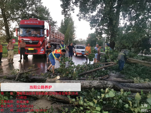 当晚6时20分,接到110险情通报后,市交通公路部门迅速集结养护、路政人员10余人,组成应急抢险队伍,携带抢险工具,调集铲车、运输车等机械设备赶赴现场。在现场,抢险人员一边设置安全警示标志,安排专人疏导交通;一边将倒伏的大树进行砍伐、分解、搬运,清除路面障碍物。经过2个多小时的紧张忙碌,道路恢复了畅通。