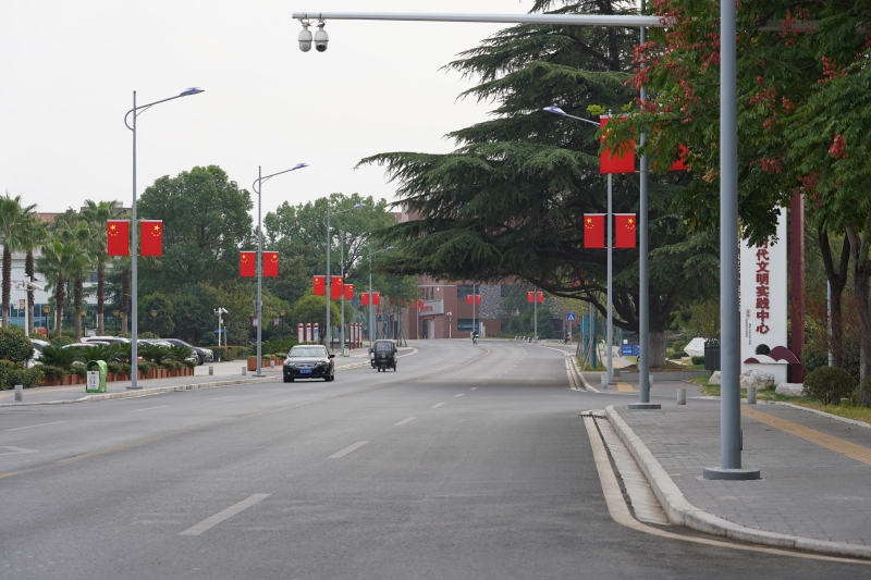 在长坂路、子龙路、玉阳路、南正街等城区主要交通干道沿线路灯上,一面面鲜红的五星红旗迎风招展,一抹抹鲜艳的“中国红”向祖国深情告白,成为城市中一道道靓丽的风景线。