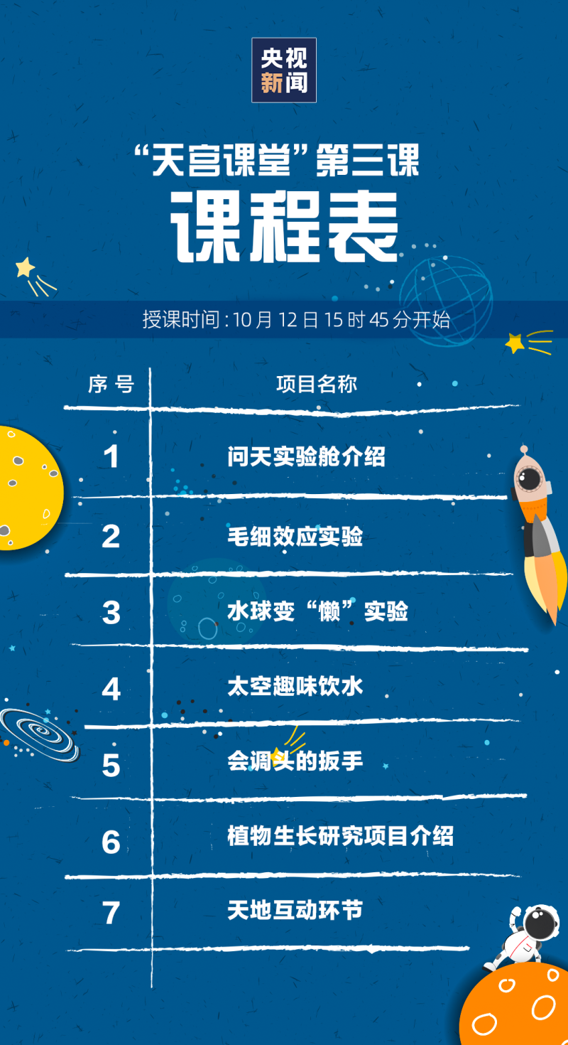 据中国载人航天工程办公室消息,“天宫课堂”第三课定于10月12日15时45分开始,神舟十四号飞行乘组航天员陈冬、刘洋、蔡旭哲将面向广大青少年进行太空授课,中央广播电视总台将面向全球进行现场直播。