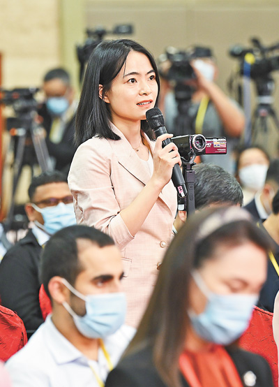记者在提问。