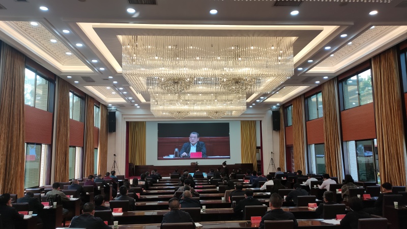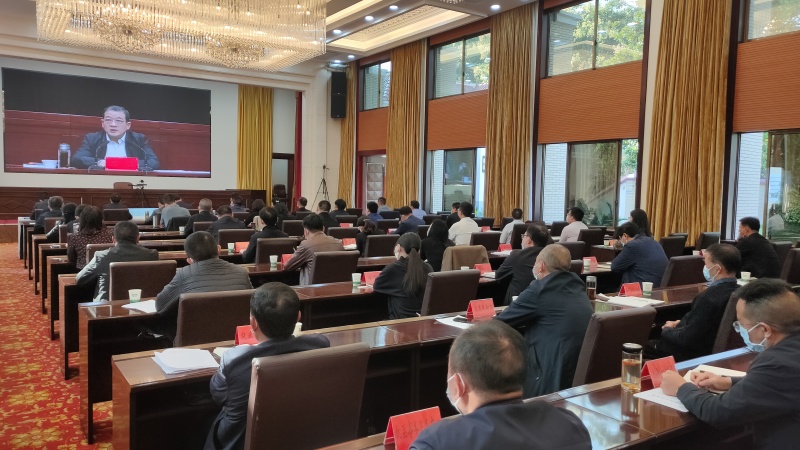 市领导陈华、廖良龙及各镇(街道)、市直各单位负责人在当阳分会场收看视频会。