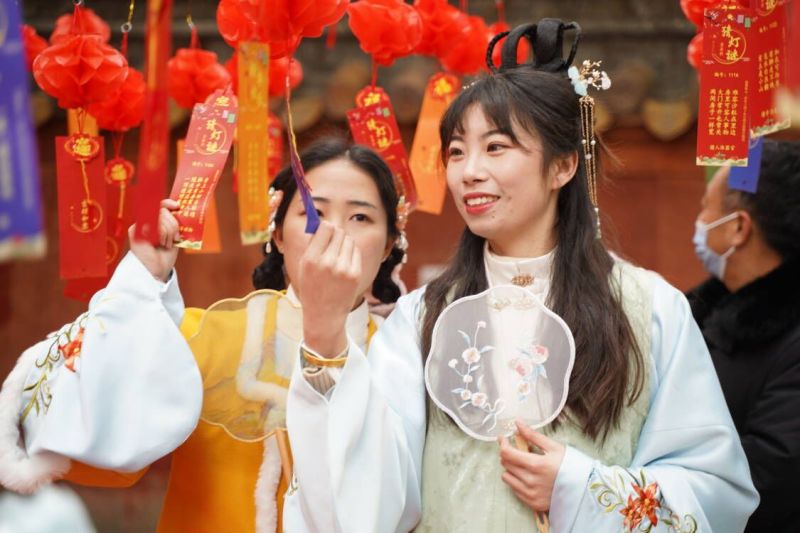庙会同样热闹非凡,“猜灯谜”、幸运圈“财”、汉服巡游、舞龙舞狮民俗及趣味文体等民俗及庙会活动,吸引了来来往往的游客驻足,现场气氛热烈。