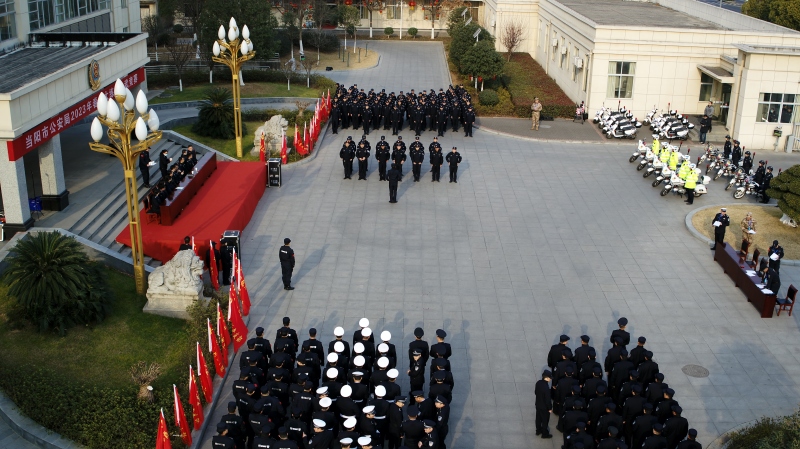 当天上午,民警辅警全副武装,严阵以待。早春阳光映照在警用头盔上熠熠生辉,干脆响亮的口号声交织在广场上空,紧张有序的比武竞赛活动正式拉开帷幕。