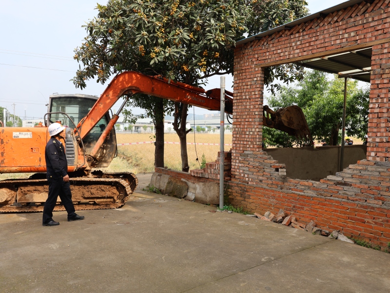 在清违现场,综合执法中心工作人员按施工要求佩戴安全帽、设置警戒线,施工人员操作大型机械设备迅速开展清违作业。此次清违行动共出动大型机械设备1台、执法车2辆、工作人员10余人。