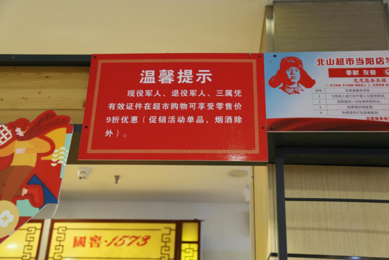 本网讯(张军)近日,市退役军人事务局工作人员来到北山超市当阳店,为超市悬挂当阳市“爱心献功臣”示范单位牌匾,工作人员还现场为超市悬挂了温馨提示,提示前来购物的现役军人、退役军人和三属,凭有效证件在超市购物可以享受9折优惠。