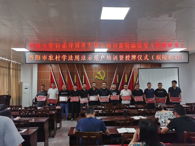 活动中, 市农业农村局工作人员通过快问快答、以案释法向在场村民讲授《中华人民共和国民法典》。随后组织全场村民共同观看习近平法治思想宣传片、禁毒宣传片,呼吁大家坚决抵制毒品,防范电信诈骗。活动最后,市农业农村局和坝陵街道办事处共同为19名农村学法用法示范户授牌。