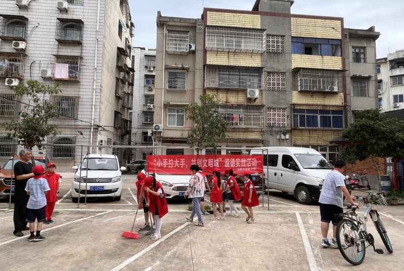 本网讯(陈夏筱)6月19日,实验小学组织部分家长和学生志愿者走出校园,走进社区,开展“小手拉大手 共创文明城”道德实践活动。