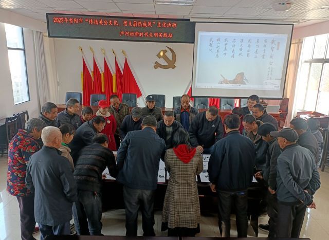 近日,严河村新时代文明实践站开展“传统关公文化,信义蔚然成风”文化活动,活动前通过微信群发布活动内容,线上招募50余名群众参与。活动中,志愿者为大家讲解关公文化精神,大家用毛笔书写“长坂雄风 信义当阳”“关云长”“忠肝义胆”等体现关公文化精神的字样。