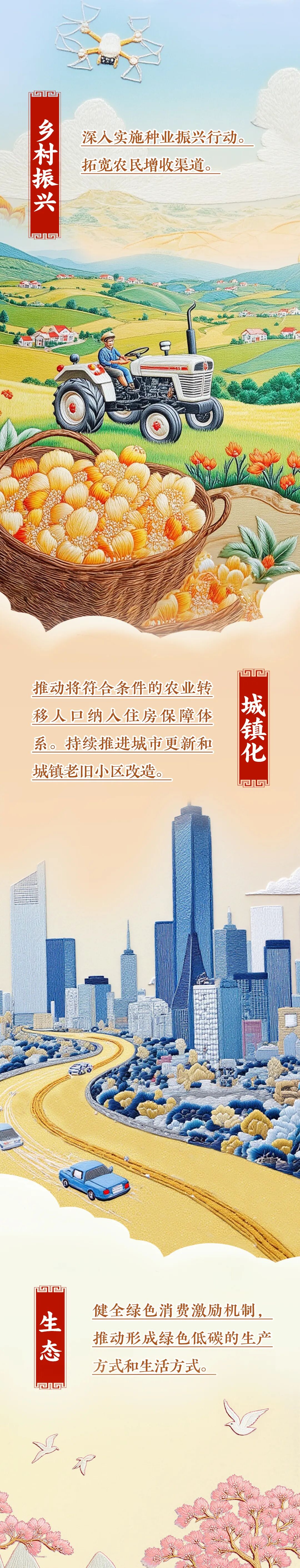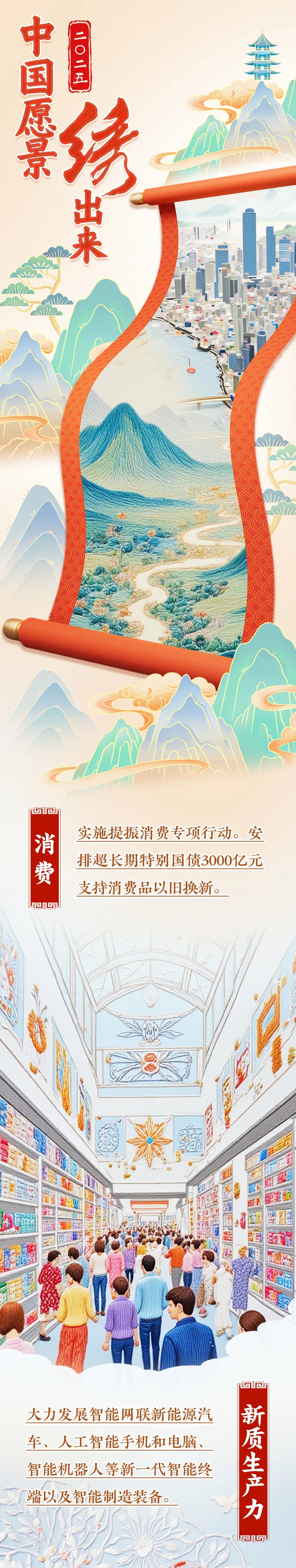 今天(3月5日),李强总理向十四届全国人大三次会议作政府工作报告,今年部分重点工作出炉。我们借助AI技术,“绣”出一幅2025中国愿景图。