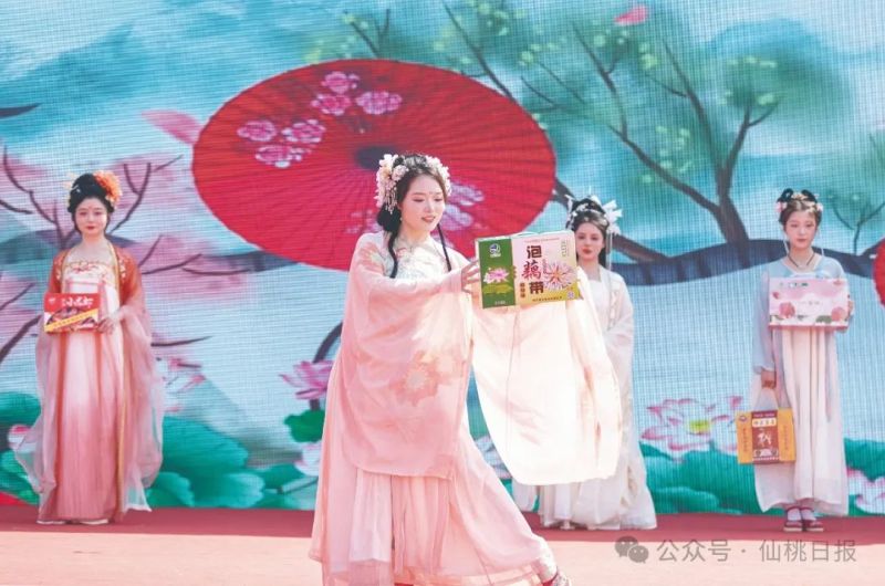 现场,舞台上,旗鼓舞燃动全场;展销区,蜂蜜、香米、桃花酒、T恤服饰……特色商品琳琅满目,市民游客接连下单。