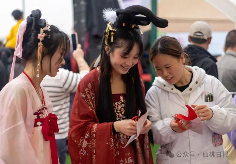桃花酒香浓,服饰走秀火热。只见模特们身着AI设计的印花 T恤,吸引众人目光。在新彩雅服饰展位,自动印花设备忙碌运行,市民游客排队等候自己“定制”的 T恤。