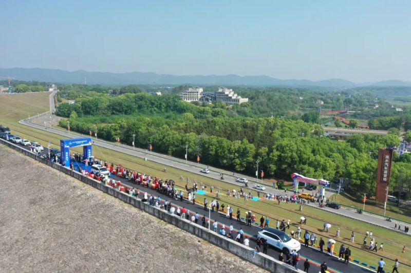 9:30,挥旗,发车,全国汽车(房车)露营集结赛第一赛段正式开赛。在“亚洲第一坝”洈水大坝上,来自全国各地的80辆房车列队出发,浩浩荡荡向荆州古城进发。该赛段全长210公里,依次途经松滋稻谷溪景区、荆州古城、松滋小南海湿地公园等打卡点。