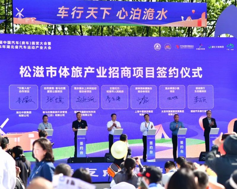 开幕式上,松滋市文体旅产业现场招商推介,总投资18.7亿元的新神洞体康融合综合体、洈水镇水上休闲运动综合体、洈水啤酒小镇、自然度假·喜马拉雅露营公园、捷途旅行生态圈、“引客入松”合作等6个文体旅项目,成功签约。“东风猛士”“齐星房车”等车企推介新款产品。