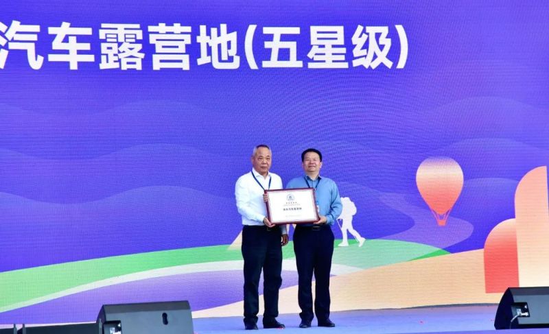 ▲中汽摩联副主席、秘书长何建东为松滋洈水汽车露营地颁发“五星级汽车自驾运动营地”牌匾