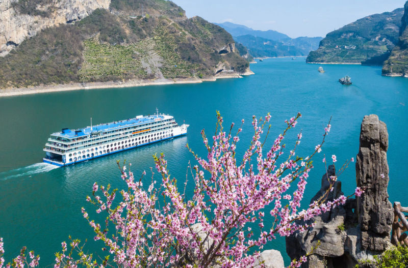 2025年3月19日,船舶行驶在长江三峡西陵峡湖北省宜昌市秭归县水域,岸上桃花绽放(无人机照片)。新华社发(郑家裕 摄)