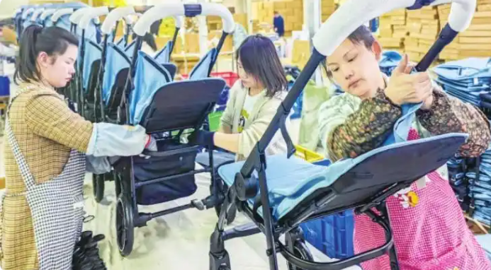 湖北三阳儿童用品有限公司的装配线上,工人们正为德国订单加急组装多功能童车。