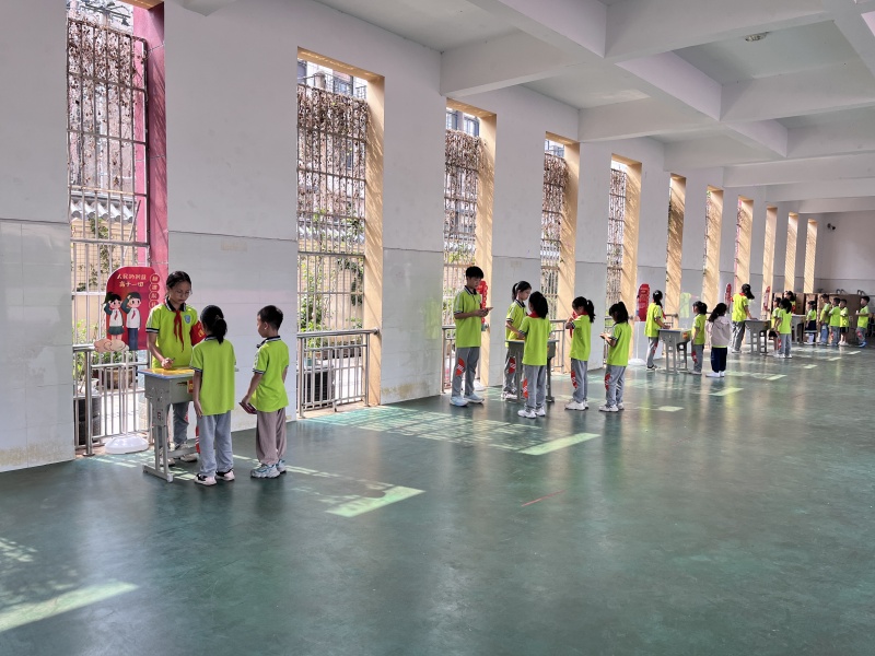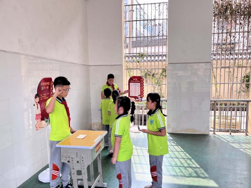 入队知识闯关活动围绕“六知六会一做”,设立了少先队知识“我知道”、“火眼金睛认标志”、“魔法领巾变整齐”等七重关卡。由学校少先队大队部学生干部化身的“小考官”们细致检验新队员对少先队队名、作风的掌握情况,检查新队员红领巾佩戴、队礼规范等实操动作;新队员们精神昂扬,流利应答、动作标准。