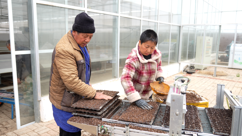 走进当阳市群益蔬菜种植专业合作社的育苗大棚,棚内绿意盎然,一个个育苗穴盘整齐地排列在育苗床上,一株株白菜、莴苣等蔬菜幼苗郁郁葱葱、长势喜人,而在一旁,工人们正忙着筛土、装盘、点种、摆盘,整个育苗流程井井有条。