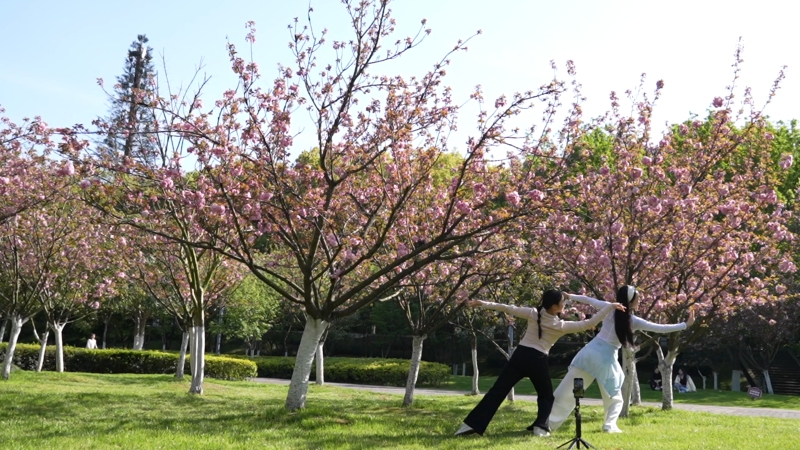 移步临沮公园,又是另一番烂漫春光。樱花绽放,满树繁花如云似雪,粉白相间的花瓣随风轻舞,营造出唯美浪漫的氛围。暖阳之下,不少市民漫步花间,驻足打卡拍照,欢声笑语萦绕枝头,一派其乐融融的温馨景象。市民刘梦露和谈芷雪说:“春天来了,花都开了。我们喜欢跳舞,所以我们想在有花的地方记录生活。”