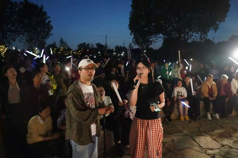 夜幕降临,歌曲大合唱与非遗皮影戏将现场氛围烘托到顶点,晚风伴着歌声与光影,尽显乡村休闲的惬意与浪漫。